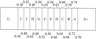 簡(jiǎn)單來(lái)說(shuō),語(yǔ)音傳輸指數(shù)是衡量語(yǔ)音傳輸質(zhì)量的一個(gè)指標(biāo),該參數(shù)可以較為全面反映混響時(shí)間、信噪比和回聲等對(duì)語(yǔ)言清晰度的影響,并且考慮了系統(tǒng)失真、心理聲學(xué)效果(掩蔽效應(yīng))等因素。它的值范圍為0~1,值越大說(shuō)明清晰度越好。好的擴(kuò)聲系統(tǒng)即使用在聲學(xué)條件較差的環(huán)境也能達(dá)到0.45到0.65的結(jié)果,而在聲學(xué)環(huán)境較好的場(chǎng)所,能達(dá)到0.70至0.90。更直觀的例子是,一間優(yōu)秀的錄音棚內(nèi),從麥克風(fēng)到監(jiān)聽音箱之間典型的STI值能達(dá)到0.90至0.97。圖1所示為評(píng)定等級(jí),圖中字母為等級(jí)名稱,上面數(shù)字代表該等級(jí)的STI中心值,下面數(shù)字代表該等級(jí)的STI邊界值。A+是極高的語(yǔ)言可懂度,A、B和C是高的語(yǔ)言可懂度,D是較好的語(yǔ)言可懂度,E是高品質(zhì)的擴(kuò)聲系統(tǒng),F(xiàn)是較好品質(zhì)的擴(kuò)聲系統(tǒng),G是語(yǔ)音報(bào)警系統(tǒng)的目標(biāo)值,H是語(yǔ)音報(bào)警系統(tǒng)的正常下限,I是有限的語(yǔ)言可懂度,J和U是STI值太低,不宜用于擴(kuò)聲系統(tǒng)。