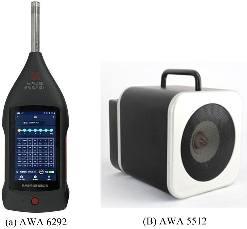 AWA6292型多功能聲級(jí)計(jì)如圖2(a)所示,是采用數(shù)字信號(hào)處理和物聯(lián)網(wǎng)技術(shù)的新一代手持式聲學(xué)測(cè)量?jī)x器,性能符合GB/T 3785.1/IEC 61672-1對(duì)1級(jí)聲級(jí)計(jì)和GB/T 3241.1/IEC 61260-1對(duì)1級(jí)濾波器的要求,可以選擇工業(yè)噪聲測(cè)量、環(huán)境噪聲測(cè)量、職業(yè)衛(wèi)生噪聲測(cè)量和建筑聲學(xué)測(cè)量等模塊。當(dāng)選用建筑聲學(xué)測(cè)量模塊時(shí),配置總值積分測(cè)量、倍頻程和1/3倍頻程濾波器、混響時(shí)間測(cè)量和STIPA測(cè)量等軟件模塊,可以完成大多數(shù)建筑聲學(xué)測(cè)量項(xiàng)目,尤其適用于廳堂和室內(nèi)場(chǎng)所的聲學(xué)和擴(kuò)聲特性測(cè)量。