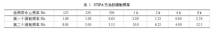 STIPA是完整STI的一種簡(jiǎn)化形式,稱之為公共廣播系統(tǒng)語(yǔ)音傳輸指數(shù)。它是基于使用較少數(shù)量的調(diào)制指數(shù)進(jìn)行的測(cè)量。STIPA測(cè)試信號(hào)僅由1個(gè)測(cè)試信號(hào)組成,在7個(gè)倍頻帶中的每一個(gè)波段都預(yù)設(shè)兩個(gè)調(diào)制如表1所示。這14個(gè)調(diào)制指數(shù)是同時(shí)產(chǎn)生的。一次測(cè)量時(shí)間僅需15~25s,比完整STI要短得多,是直接方法的主要應(yīng)用途徑。調(diào)制指數(shù)也可以使用間接法得出,稱為STIPA(IR)。