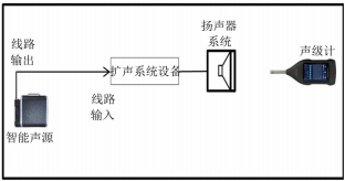 對(duì)場(chǎng)景2,預(yù)先錄制公告的擴(kuò)聲系統(tǒng)如圖4所示。如果擴(kuò)聲系統(tǒng)不含系統(tǒng)傳聲器而是直接通過播放器播放音頻,則需要通過外部信號(hào)發(fā)生器(智能聲源線路輸出)將STIPA信號(hào)輸入至系統(tǒng)中,通過調(diào)節(jié)擴(kuò)音系統(tǒng)持續(xù)播放大小可調(diào)的STIPA測(cè)試信號(hào)。測(cè)量時(shí),擴(kuò)聲系統(tǒng)處于最高可用增益工作狀態(tài),測(cè)試信號(hào)通過擴(kuò)聲調(diào)音臺(tái)線路輸入擴(kuò)聲系統(tǒng),擴(kuò)聲系統(tǒng)處于穩(wěn)定工作狀態(tài)。