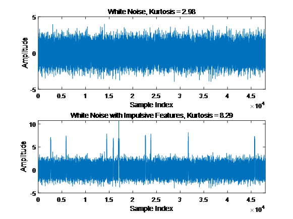 這樣服從正態(tài)分布的數(shù)據(jù)的峰度值為0,因?yàn)檎龖B(tài)分布的四階中心矩與方差平方的比值恰好等于3。簡單來說,峰度可以用來描述信號的非平穩(wěn)特性,尤其是短時(shí)間內(nèi)突發(fā)的噪聲干擾,如果一段數(shù)據(jù)的峰度值越大,則表明該段數(shù)據(jù)中含有的突發(fā)性噪聲干擾成分較多。下面以一段數(shù)據(jù)分析對比為例,采用信號仿真方法生成一組隨機(jī)白噪聲信號和一組添加有突發(fā)性沖擊干擾的白噪聲信號,分別計(jì)算兩組信號的峰度值可以發(fā)現(xiàn),含有突發(fā)性沖擊特征干擾的白噪聲信號的峰度值為8.29,明顯大于不含有干擾的白噪聲信號2.98。